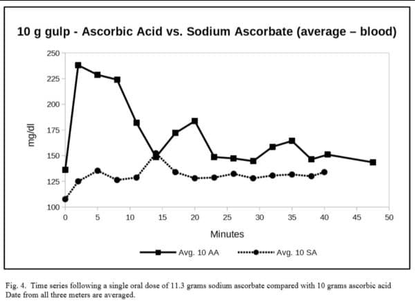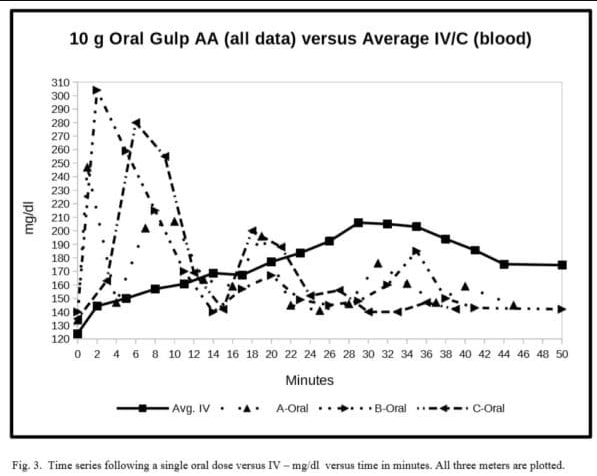 Az egyikben 10 g aszkorbinsav éhgyomorra való elfogyasztását szájon át hasonlították össze 11,3 g Na-aszkorbát intravénásan történő adagolásával (azért ennyivel, mert ennyi felel meg 10 g aszkorbinsavnak. Aszkorbinsavat azonban intravénásan nem lehet beadni, csak nátrium(Na)-aszkorbátot, a vér pH értéke miatt…). Eszeveszett meglepő lett az eredmény: Az egyszerre bevett 10 g aszkorbinsav dupla olyan magasra emelte a vér C-vitamin szintjét, mint a 10 g C-vitamin intravénásan! De még hogyan: A bevételt követő 3. percben volt ilyen magas rövid ideig, majd pár perccel később leesett a kezdeti szintre, majd pár perccel később újra megnőtt extrém magasra, de már kevésbé magasra, majd megint leesett, majd megint megnőtt, de már egyre kevésbé. Azaz úgy fél órán keresztül hullámzott. (E hullámzás oka feltehetően az, hogy amikor leesik a szint, olyankor bedokkol a sejtek receptoraiba, ami alatt a vérből eltűnik, majd a sejtekben regenerálódik és visszakerül a vérbe, újra és újra… Az pedig, hogy 3 perc alatt megjelenik a véráramban az elfogyasztást követően, azért van, mert a gyomorból közvetlenül is fel tud szívódni a C-vitamin, ha az aszkorbinsav formában van, megfelelően nagy koncentrációban és elég savas a gyomor. A gyomorban van ugyanis az SVCT1-es transzporter, mely korlátlan mennyiségben képes az aszkorbinsavat és esetleg más gyenge savakat is a véráramba juttatni láthatóan hihetetlen hatékonysággal, amennyiben elég savas a gyomor. [2,11] Szerencsére az ember gyomorsav termelése a dögevőkével azonos, azaz ha már min. 2-3órája nem ettünk, akkor 1 körüli pH-jú egy egészséges ember gyomor pH-ja, ami 10-100x savasabb, mint pl. a ragadozóké).[12]